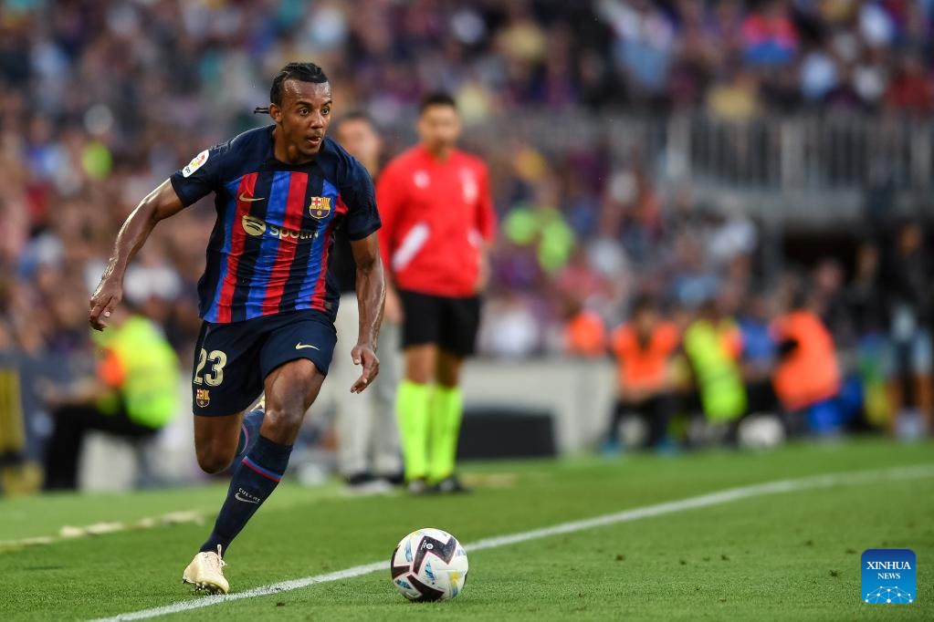 Barcelona's Joules Kounde competes during a La Liga Santander match between FC Barcelona and Real Valladolid CF in Camp Nou, Barcelona, Spain, on Aug. 28, 2022. (Str/Xinhua)