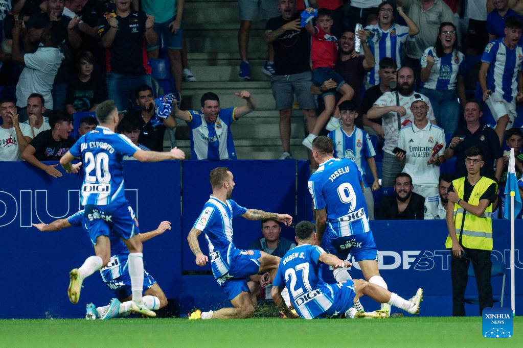Espanyol's players celebrate a goal during a La Liga Santander match between RCD Espanyol and Real Madrid in RCDE Stadium, Barcelona, Spain, on Aug. 28, 2022. (Photo by Joan Gosa/Xinhua)