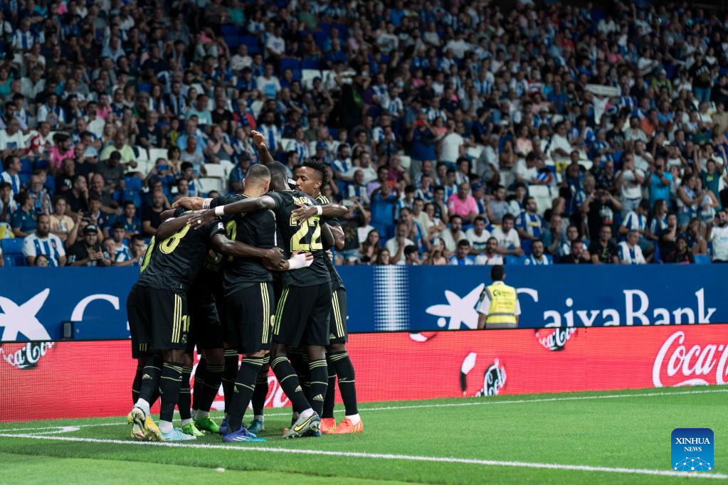 Real Madrid's players celebrate a goal during a La Liga Santander match between RCD Espanyol and Real Madrid in RCDE Stadium, Barcelona, Spain, on Aug. 28, 2022. (Photo by Joan Gosa/Xinhua)