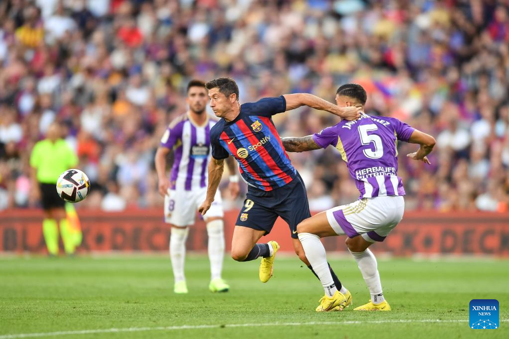 Barcelona's Robert Lewandowski (2nd R) vies with Valladolid's Javi Sanchez during a La Liga Santander match between FC Barcelona and Real Valladolid CF in Camp Nou, Barcelona, Spain, on Aug. 28, 2022. (Str/Xinhua)