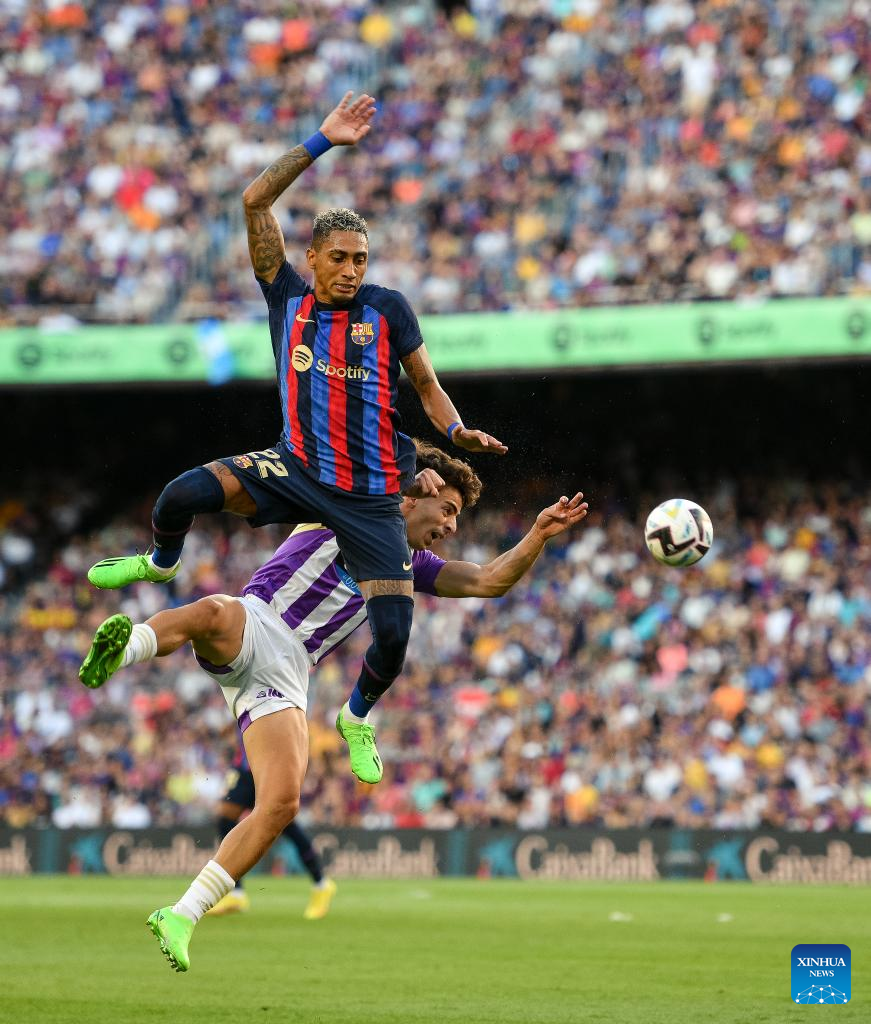 Barcelona's Raphinha (top) vies with Valladolid's Alvaro Aguado during a La Liga Santander match between FC Barcelona and Real Valladolid CF in Camp Nou, Barcelona, Spain, on Aug. 28, 2022. (Str/Xinhua)