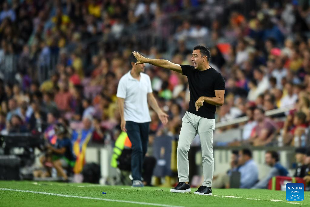 Barcelona's head coach Xavi Hernandez reacts during a La Liga Santander match between FC Barcelona and Real Valladolid CF in Camp Nou, Barcelona, Spain, on Aug. 28, 2022. (Str/Xinhua)