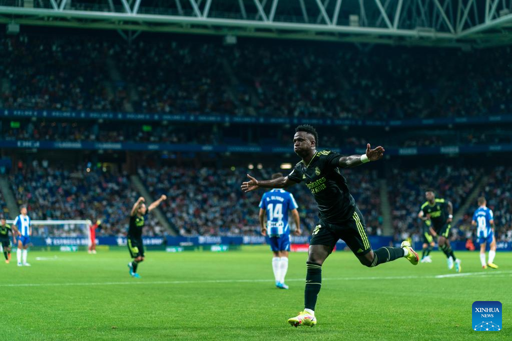 Real Madrid's Vinicius Jr. celebrates a goal during a La Liga Santander match between RCD Espanyol and Real Madrid in RCDE Stadium, Barcelona, Spain, on Aug. 28, 2022. (Photo by Joan Gosa/Xinhua)