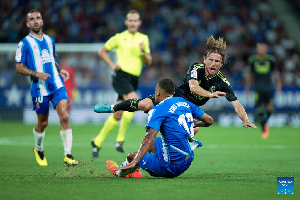 Real Madrid's Luka Modric (top) vies with Espanyol's Vini Souza during a La Liga Santander match between RCD Espanyol and Real Madrid in RCDE Stadium, Barcelona, Spain, on Aug. 28, 2022. (Photo by Joan Gosa/Xinhua)