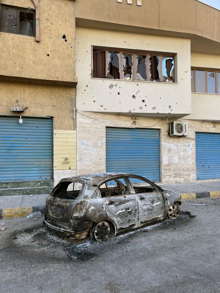 A damaged vehicle and broken windows are seen after clashes in central Tripoli, Libya, on Aug. 27, 2022. (Photo by Hamza Turkia/Xinhua)