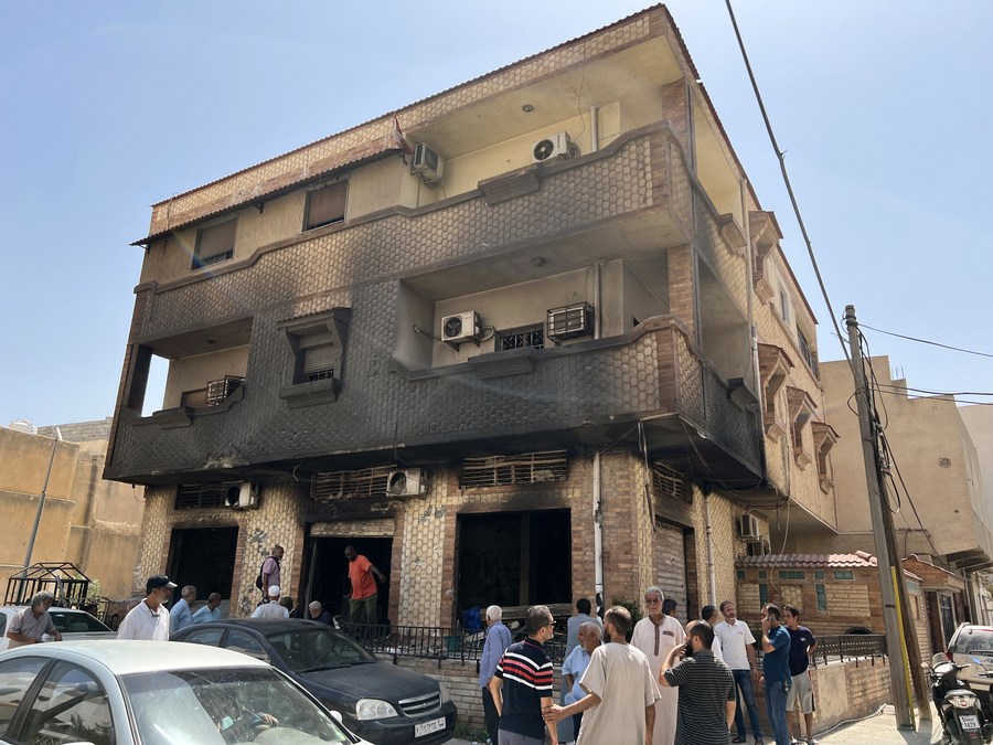 People are seen near the damaged house after clashes in central Tripoli, Libya, on Aug. 28, 2022. (Photo by Hamza Turkia/Xinhua)