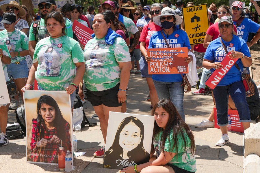 People participate in a demonstration to seek age raise for AR-15 sales in Austin, Texas, the United States, Aug. 27, 2022. (Photo by Bo Lee/Xinhua)