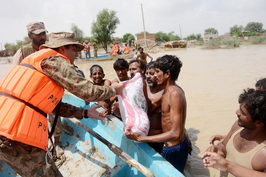 Pakistani soldiers distribute relief packages to flood-affected people in Rajanpur district of Pakistan's Punjab province on Aug. 27, 2022. (Photo by Mansoor/Xinhua)