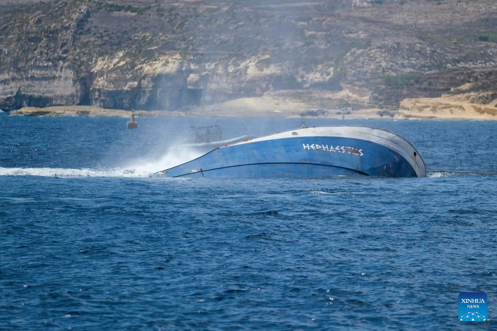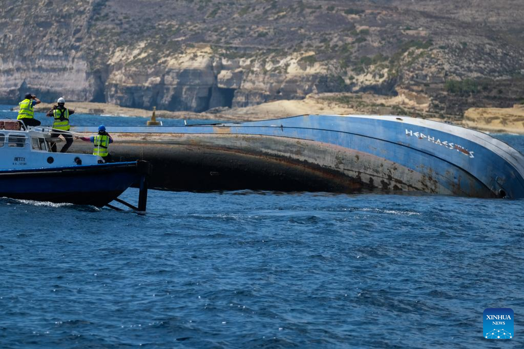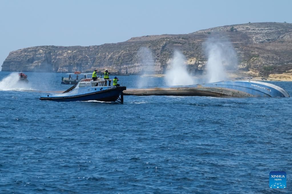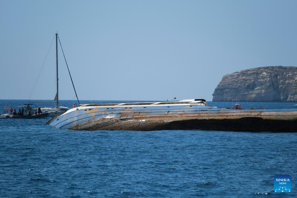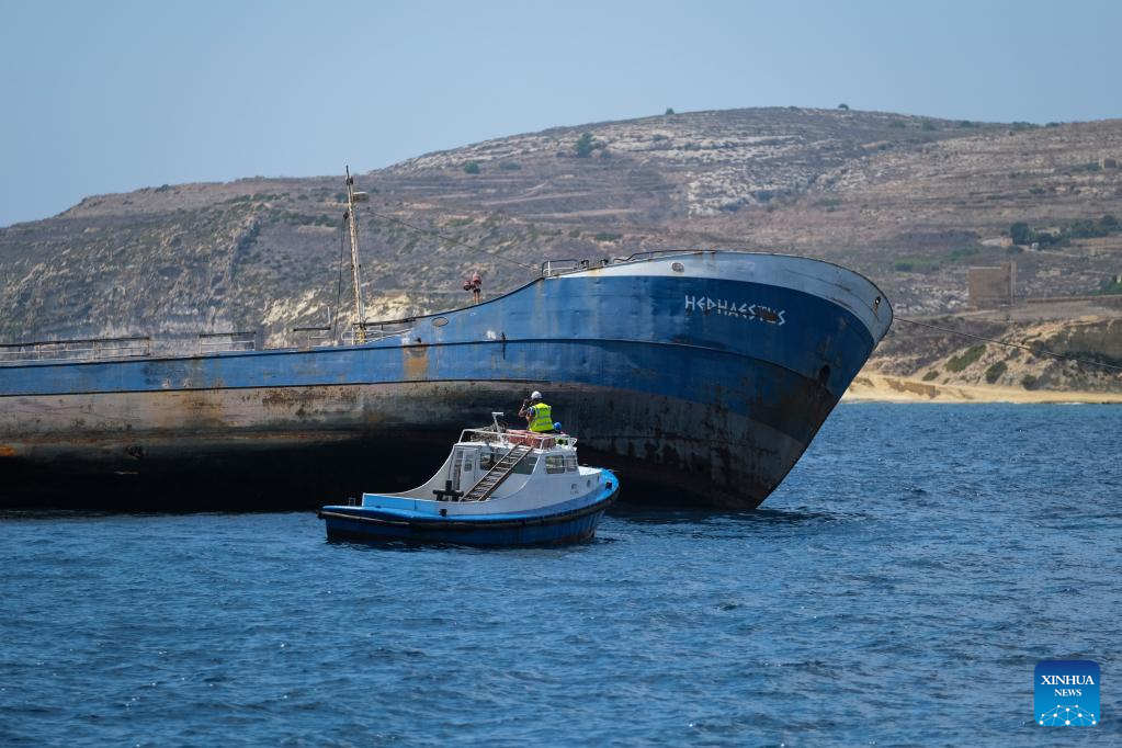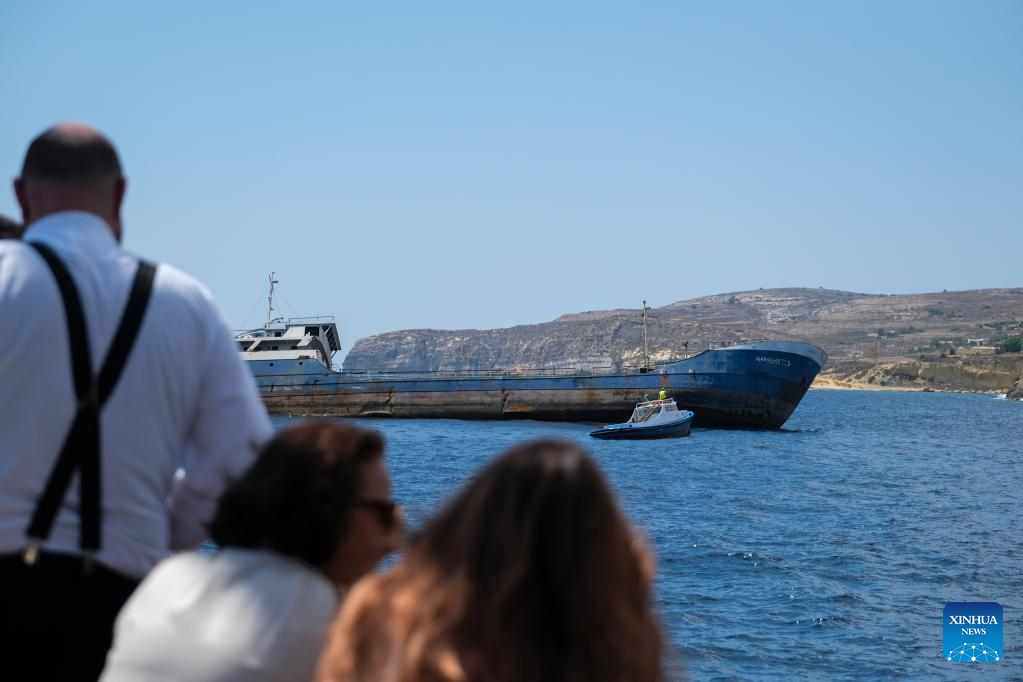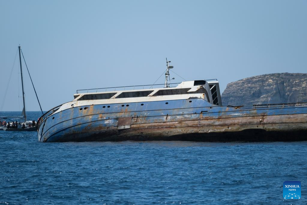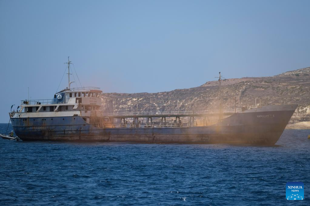 Photo taken on Aug. 29, 2022 shows an oil tanker being scuttled in Gozo, Malta. A 60-meter wide and 855-tonne heavy oil tanker was scuttled off Gozo island on Monday. It will start its new life as an artificial reef to attract divers from local and abroad. The tanker ran aground on the coast of Malta in February 2018 and got retired from service after being found the repair was too costly, according to Maltese media. (Photo by Jonathan Borg/Xinhua)
