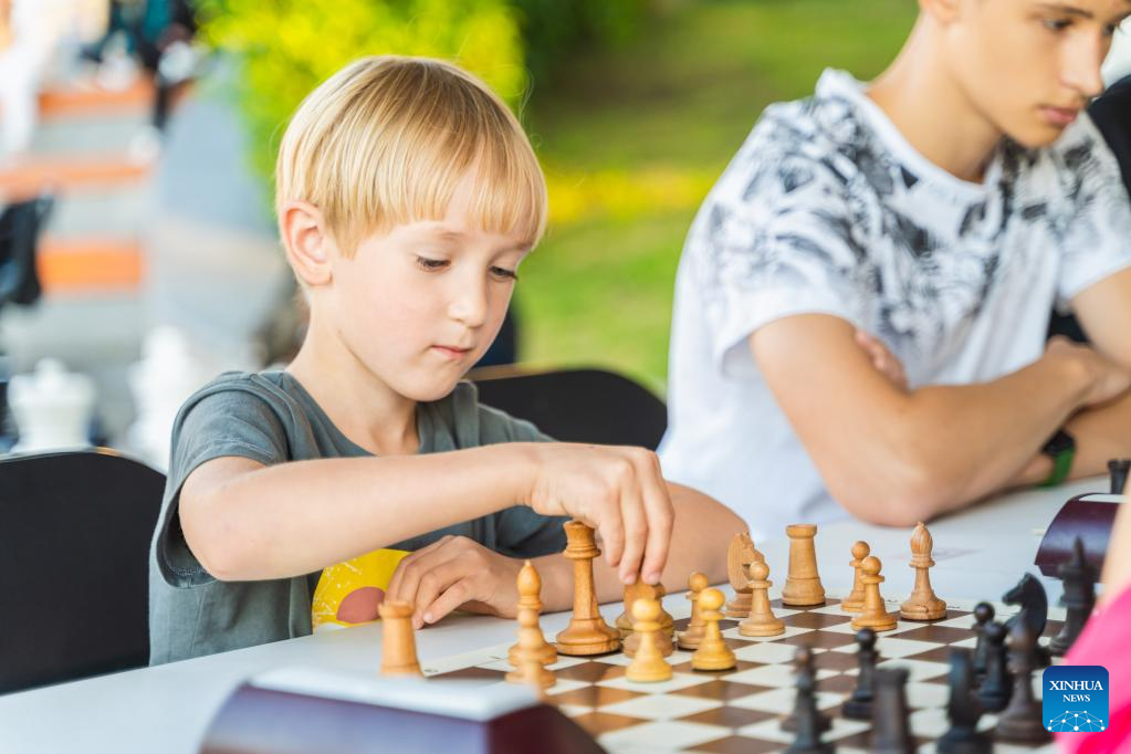 A boy plays chess at a chess tent in Vladivostok, Russia, on Aug. 31, 2022. A chess tent was set up on a street in Vladivostok to promote chess culture. Chess fans can play for free and get guidance from professional tutors. (Photo by Guo Feizhou/Xinhua)