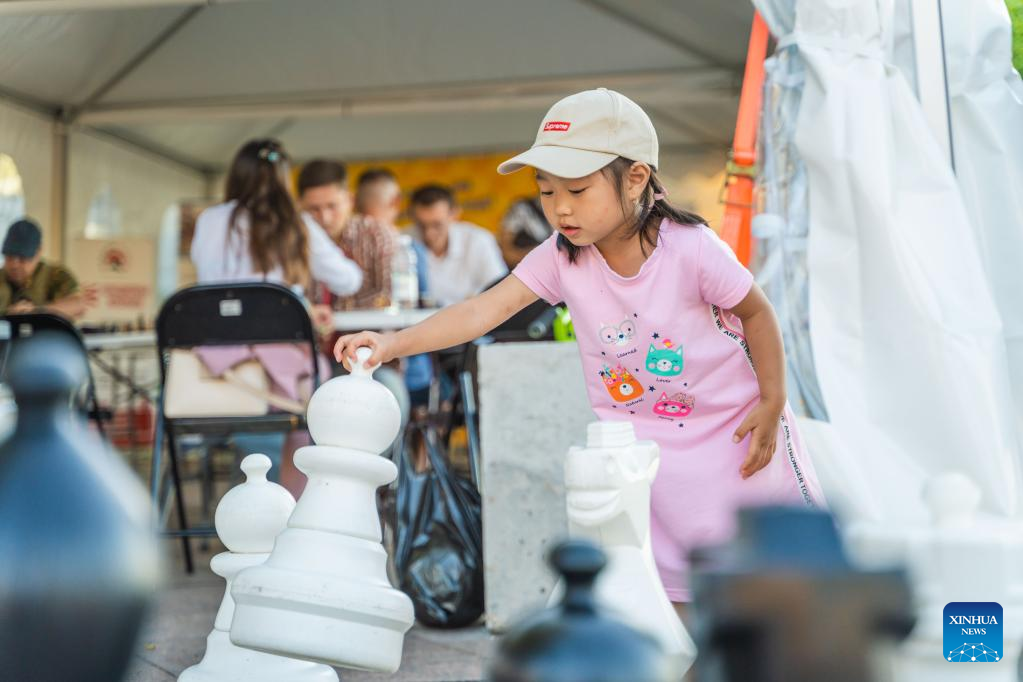 A girl plays chess at a chess tent in Vladivostok, Russia, on Aug. 31, 2022. A chess tent was set up on a street in Vladivostok to promote chess culture. Chess fans can play for free and get guidance from professional tutors. (Photo by Guo Feizhou/Xinhua)