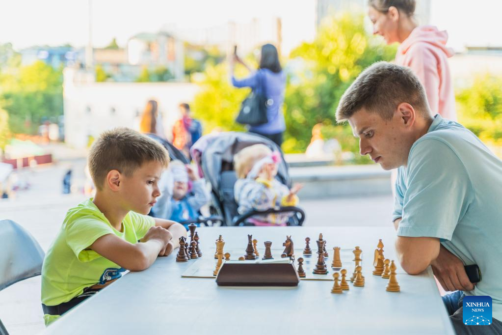People play chess at a chess tent in Vladivostok, Russia, on Aug. 31, 2022. A chess tent was set up on a street in Vladivostok to promote chess culture. Chess fans can play for free and get guidance from professional tutors. (Photo by Guo Feizhou/Xinhua)
