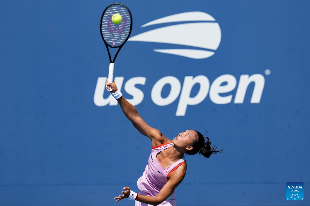 Zheng Qinwen of China serves during the women's singles first round match against Jelena Ostapenko of Latvia at the 2022 US Open tennis championships in New York, the United States, Aug. 30, 2022. (Xinhua/Liu Jie)