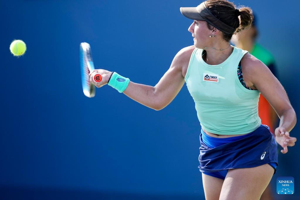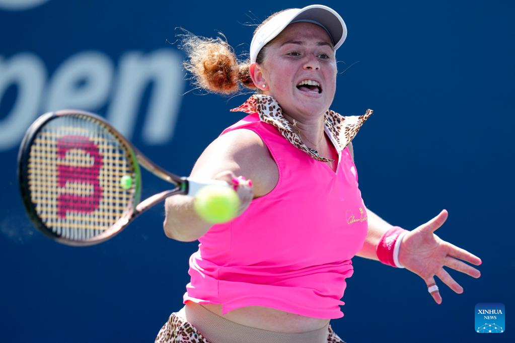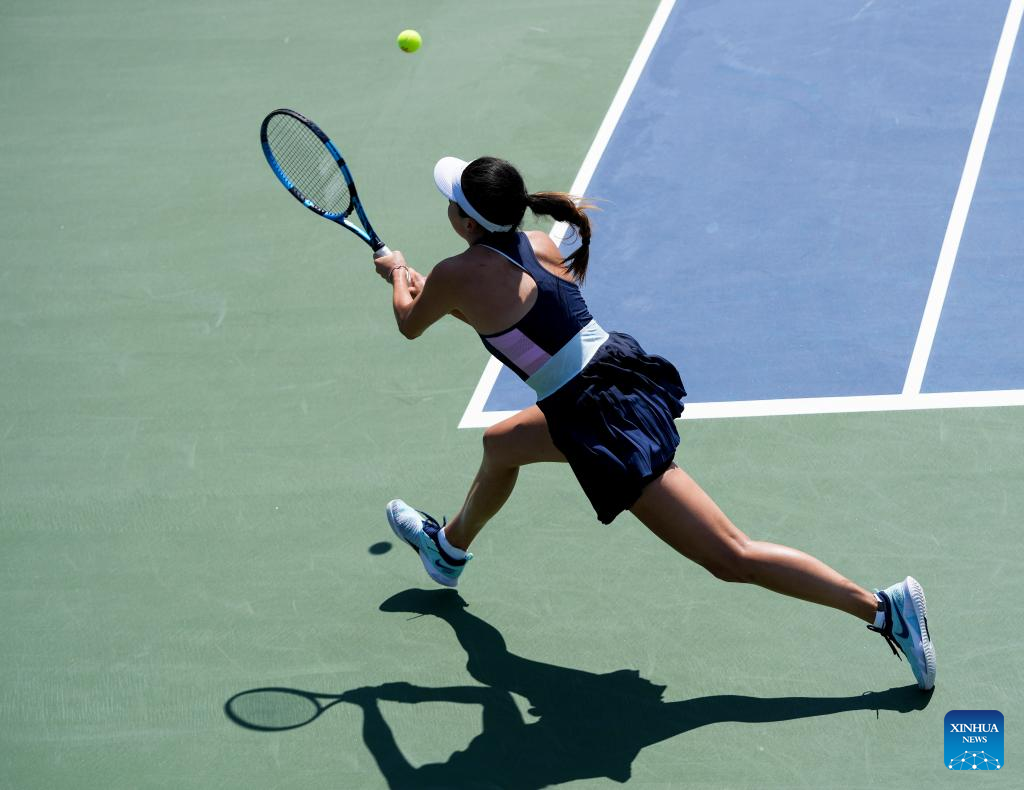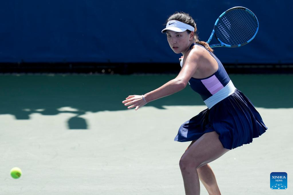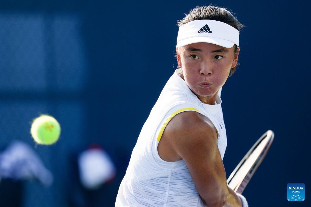 Wang Xinyu of China hits a return during the women's singles first round match against Linda Fruhvirtova of the Czech Republic at the 2022 US Open tennis championships in New York, the United States, Aug. 30, 2022. (Xinhua/Liu Jie)
