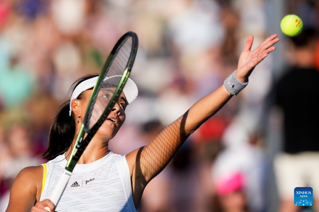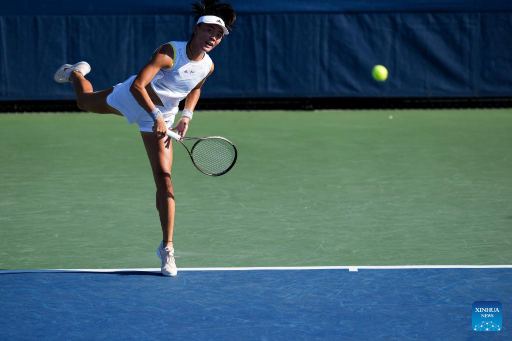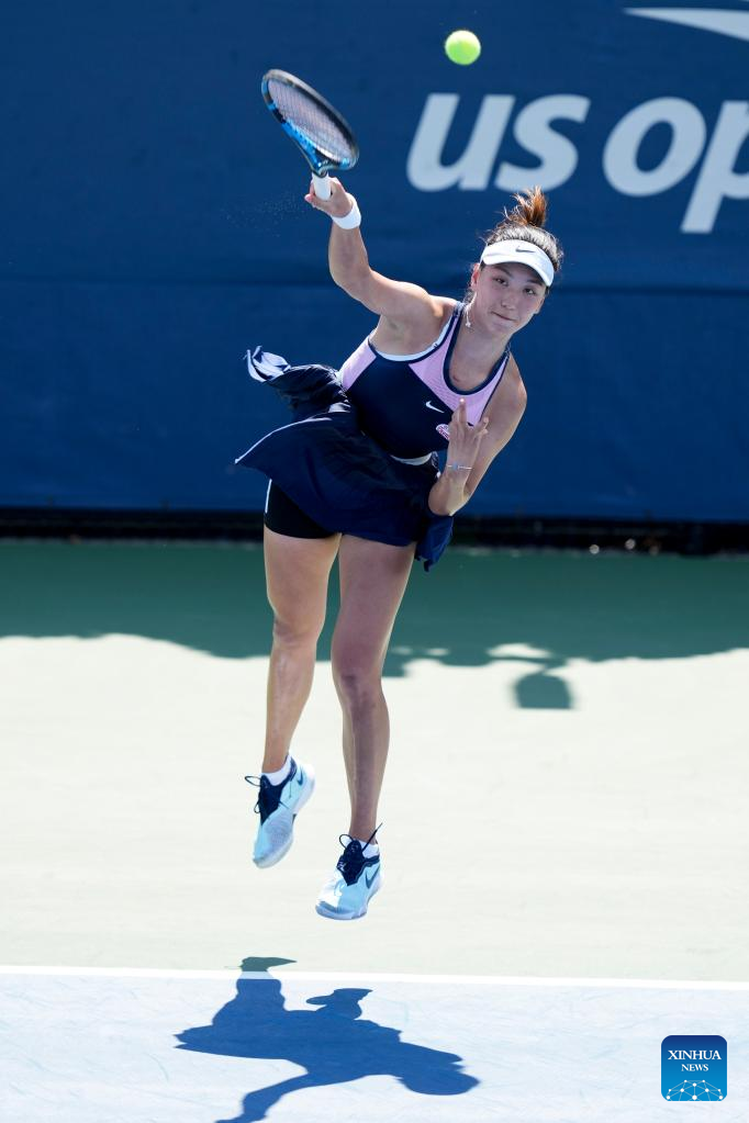 Wang Xinyu of China serves during the women's singles first round match against Linda Fruhvirtova of the Czech Republic at the 2022 US Open tennis championships in New York, the United States, Aug. 30, 2022. (Xinhua/Liu Jie)