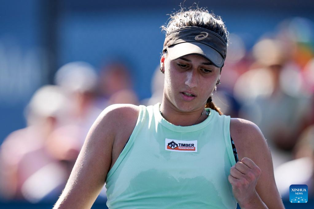 Jaimee Fourlis of Australia reacts during the women's singles first round match against Yuan Yue of China at the 2022 US Open tennis championships in New York, the United States, Aug. 30, 2022. (Xinhua/Liu Jie)