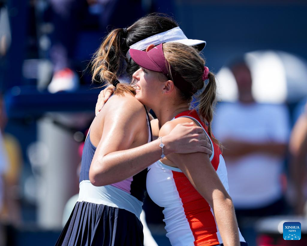 Wang Xinyu (L) of China hugs Linda Fruhvirtova of the Czech Republic after their women's singles first round match at the 2022 US Open tennis championships in New York, the United States, Aug. 30, 2022. (Xinhua/Liu Jie)