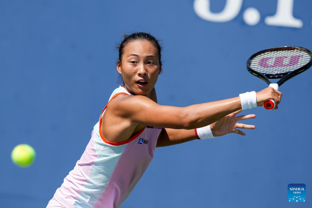 Zheng Qinwen of China hits a return during the women's singles first round match against Jelena Ostapenko of Latvia at the 2022 US Open tennis championships in New York, the United States, Aug. 30, 2022. (Xinhua/Liu Jie)