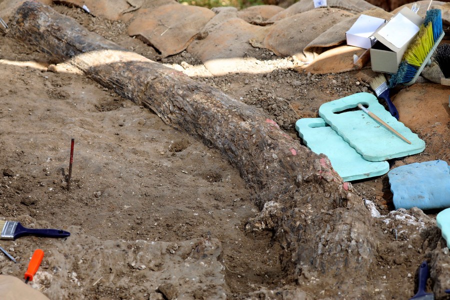 Photo taken on Aug. 31, 2022 shows a 500,000-year-old elephant tusk near the southern Israeli city of Gedera. (Photo by Gil Cohen Magen/Xinhua)