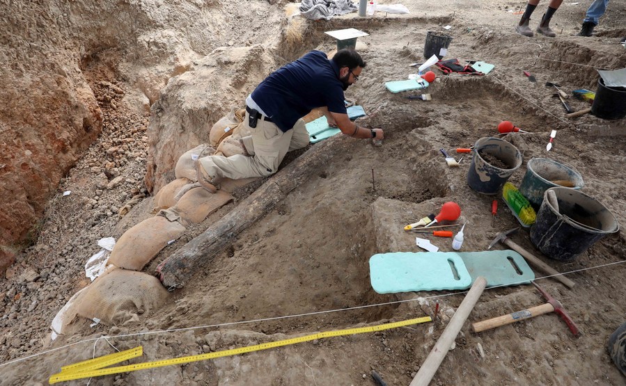 Archaeologists from Israel Antiquities Authority work at the site where a 500,000-year-old elephant tusk was discovered near the southern Israeli city of Gedera, Aug 31, 2022. (Photo by Gil Cohen Magen/Xinhua)