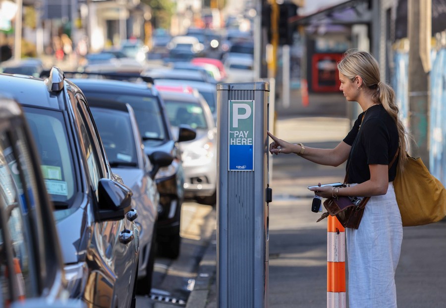 A woman pays for parking fee on a street in Wellington, New Zealand, April 22, 2022. (Photo by Meng Tao/Xinhua)