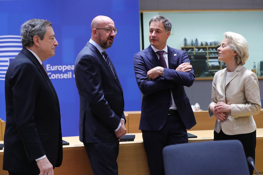 Italian Prime Minister Mario Draghi, President of the European Council Charles Michel, Belgian Prime Minister Alexander De Croo and European Commission President Ursula von der Leyen (L to R) talk before a special meeting of the European Council in Brussels, Belgium, May 31, 2022. (Xinhua/Zheng Huansong)
