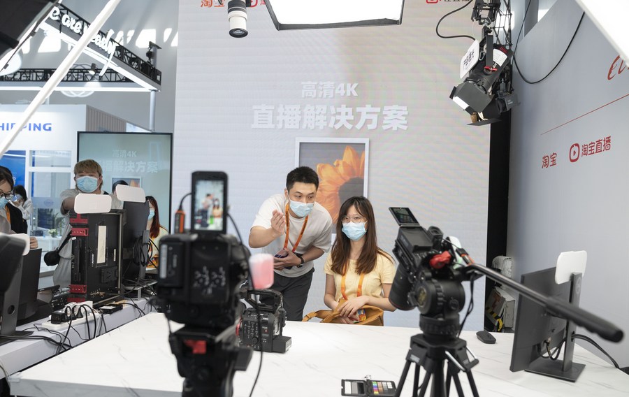 People experience 4K livestreaming at the booth of Alibaba during the 2022 China International Fair for Trade in Services (CIFTIS) in Beijing, capital of China, on Sept. 1, 2022. (Xinhua/Cai Yang)