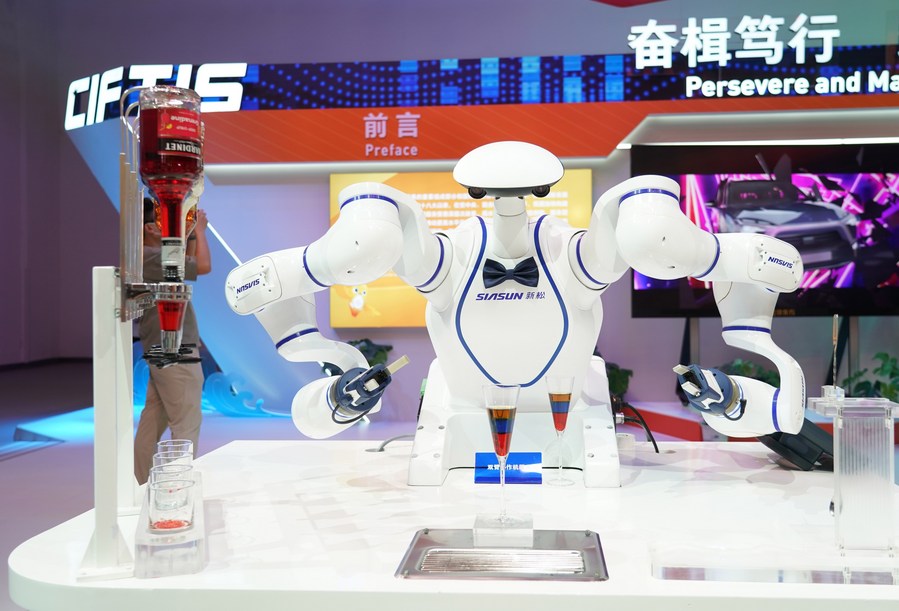 A robot is displayed at the Achievement Exhibition of China's Trade in Services during the 2022 China International Fair for Trade in Services (CIFTIS) in Beijing, capital of China, on Sept. 1, 2022. (Xinhua/Ren Chao)
