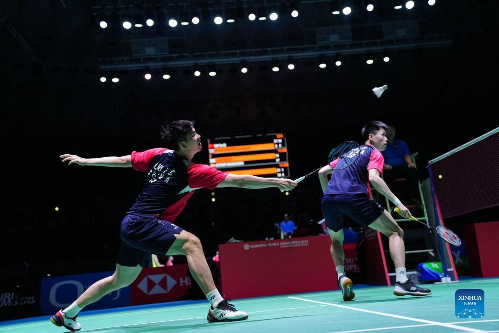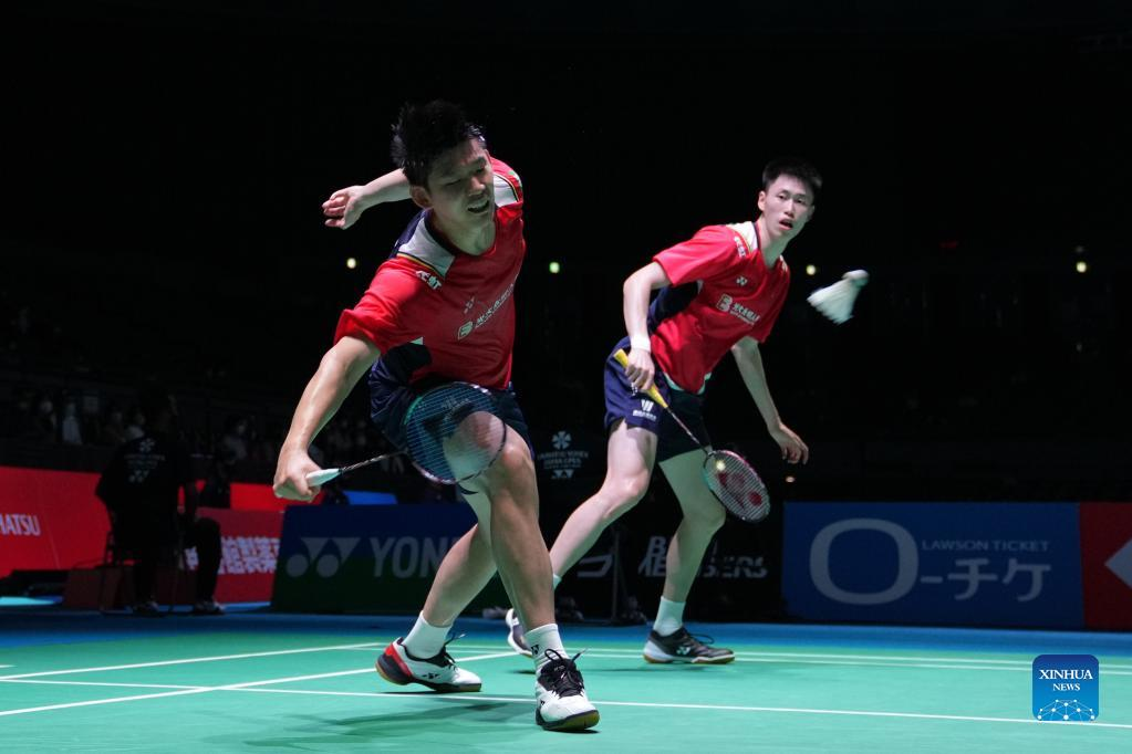Liu Yuchen (L)/Ou Xuanyi of China compete during the men's doubles quarter-final match against Kim Gi Jung/Kim Sa Rang of South Korea at the Japan Open 2022 badminton tournament in Osaka, Japan, Sept. 2, 2022. (Xinhua/Zhang Xiaoyu)