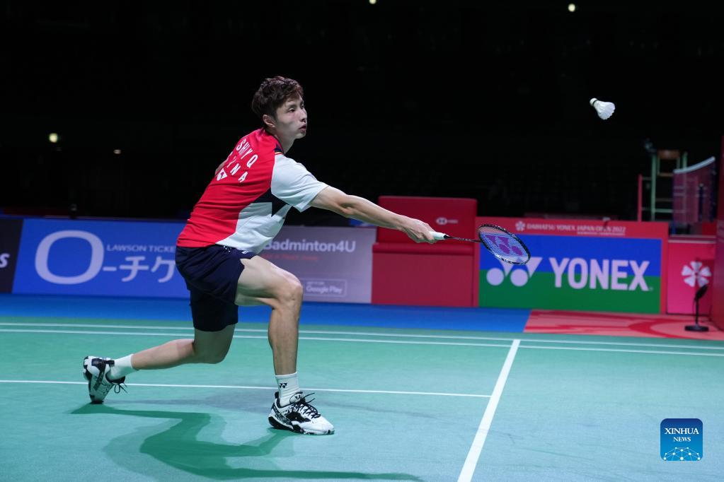 Shi Yuqi of China hits a return during the men's singles quarter-final match against Kantaphon Wangcharoen of Thailand at the Japan Open 2022 badminton tournament in Osaka, Japan, Sept. 2, 2022. (Xinhua/Zhang Xiaoyu)