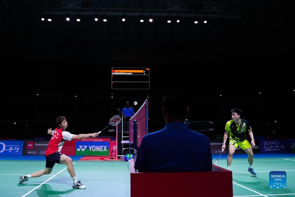 Shi Yuqi (L) of China and Kantaphon Wangcharoen of Thailand compete during their men's singles quarter-final match at the Japan Open 2022 badminton tournament in Osaka, Japan, Sept. 2, 2022. (Xinhua/Zhang Xiaoyu)