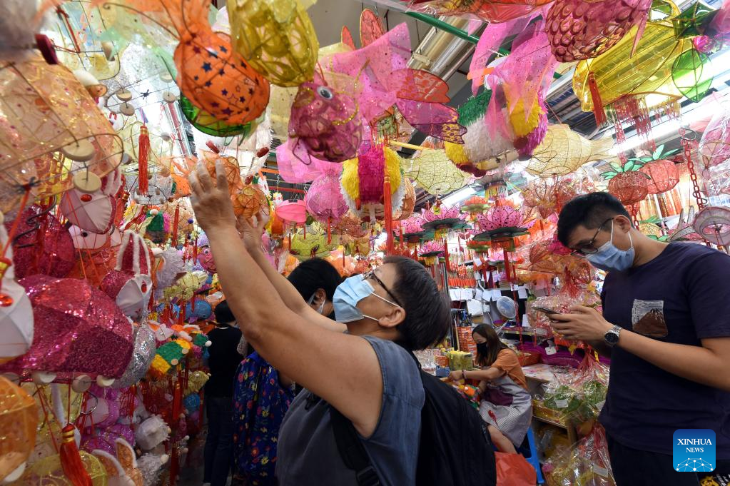 People select lanterns in celebration of the upcoming Mid-Autumn Festival at a street market in south China's Hong Kong, Sept. 2, 2022. (Xinhua/Lo Ping Fai)