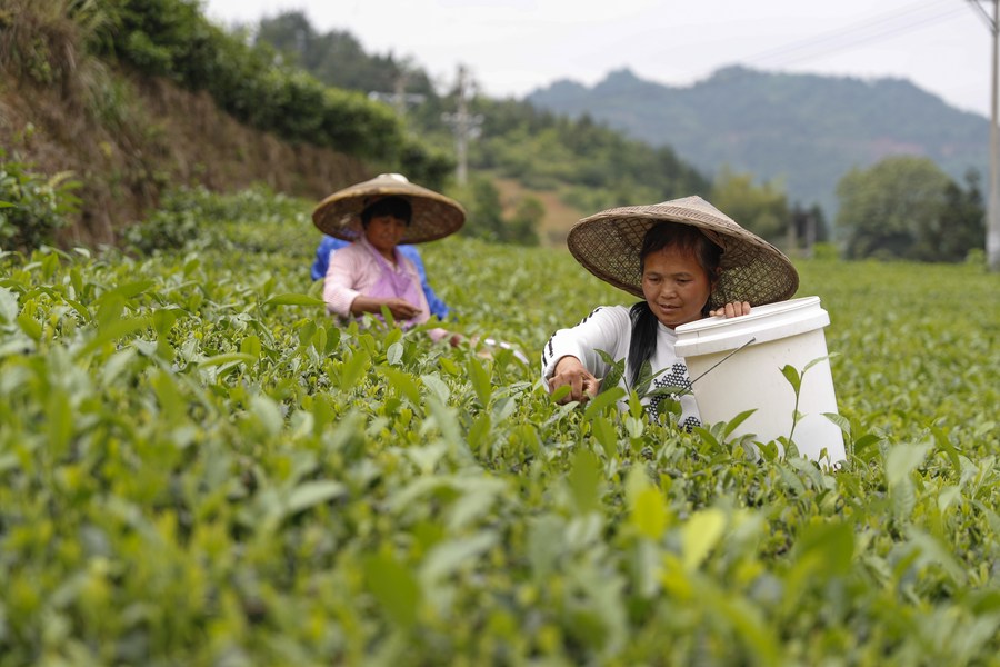 Villagers pick tea leaves at a tea plantation in Xinyuan Village of Xiushan Tujia and Miao Autonomous County in Chongqing, southwest China, May 17, 2020. (Photo by Huang Wei/Xinhua)