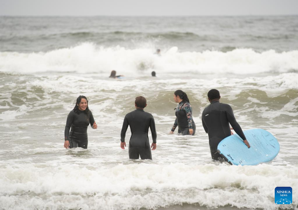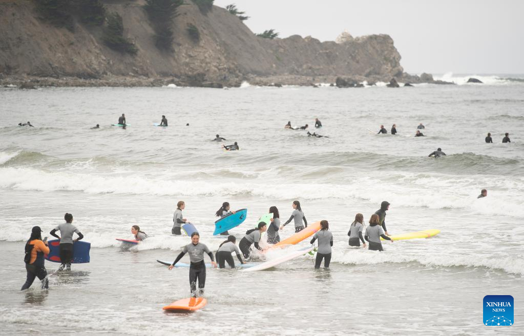 People surf amid high temperature at the Pacifica Beach in north California, the United States, Sept. 2, 2022. (Photo by Li Jianguo/Xinhua)