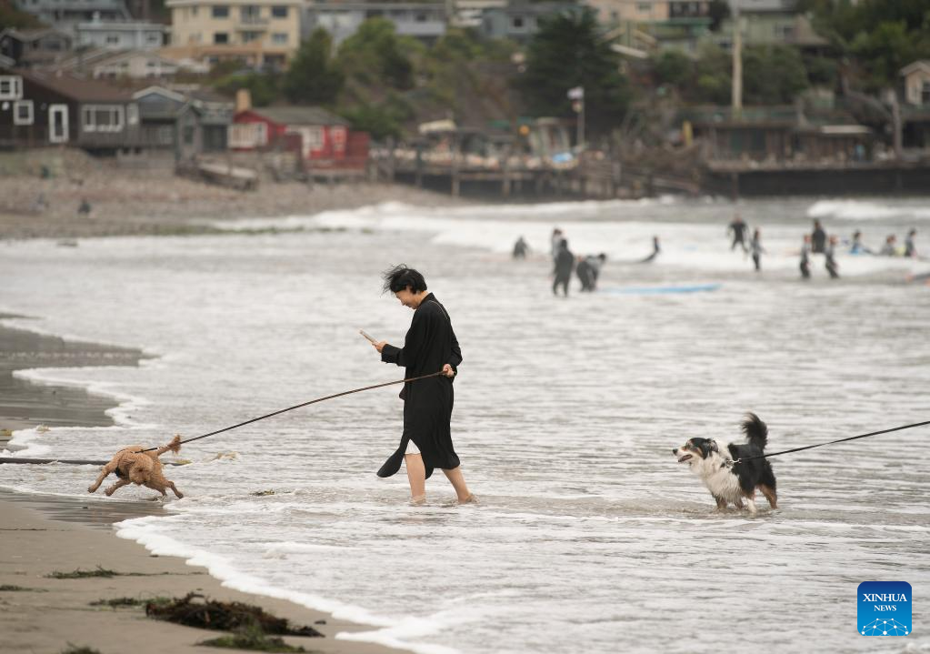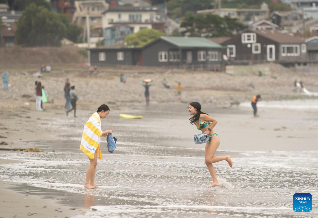 People enjoy coolness amid high temperature at the Pacifica Beach in north California, the United States, Sept. 2, 2022. (Photo by Li Jianguo/Xinhua)