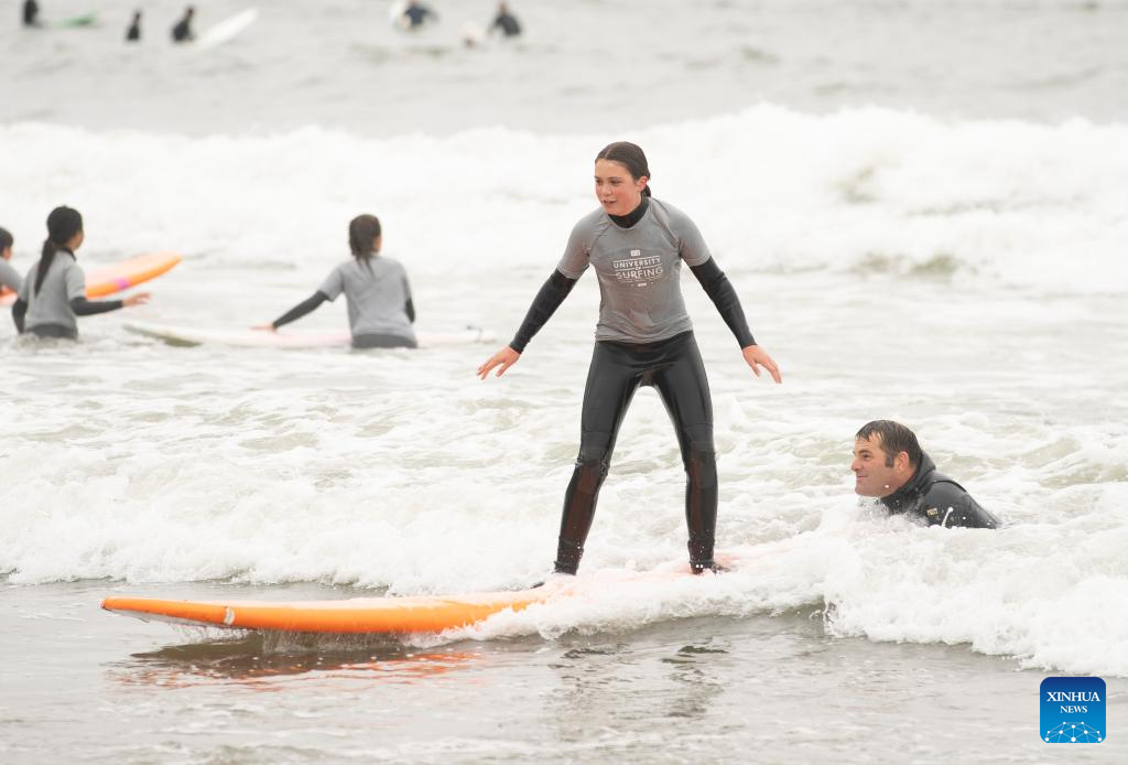 A girl surfs amid high temperature at the Pacifica Beach in north California, the United States, Sept. 2, 2022. (Photo by Li Jianguo/Xinhua)