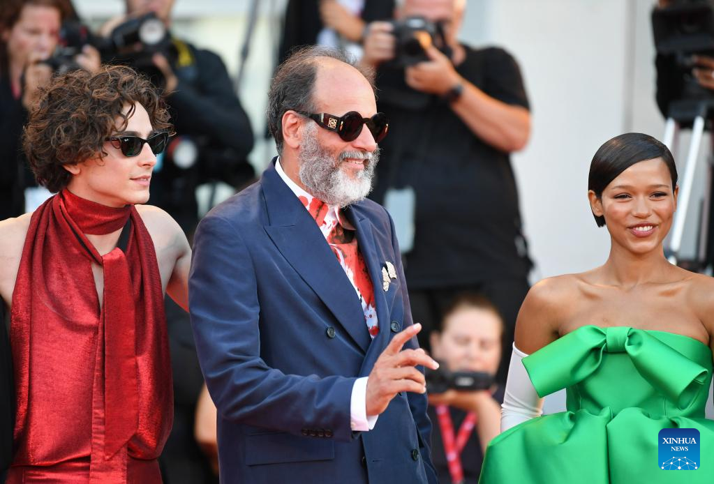 Director Luca Guadagnino (C), actor Timothee Chalamet and actress Taylor Russell pose on the red carpet for the premiere of the film "Bones and All" during the 79th Venice International Film Festival in Venice, Italy, on Sept. 2, 2022. (Xinhua/Jin Mamengni)