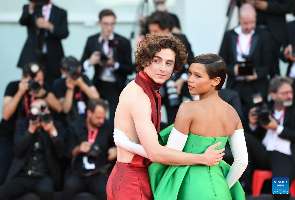 Actor Timothee Chalamet and actress Taylor Russell pose on the red carpet for the premiere of the film "Bones and All" during the 79th Venice International Film Festival in Venice, Italy, on Sept. 2, 2022. (Xinhua/Jin Mamengni)