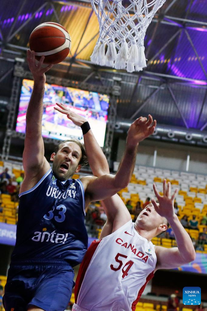 Kiril Wachsmann (L) of Uruguay goes for a lay-up during a group A match between Canada and Uruguay at the FIBA Americup 2022 in Recife, Pernambuco, Brazil, Sept. 3, 2022. (Photo by Lucio Tavora/Xinhua)