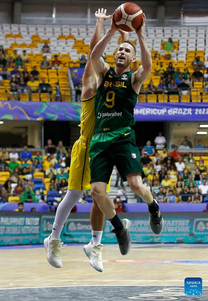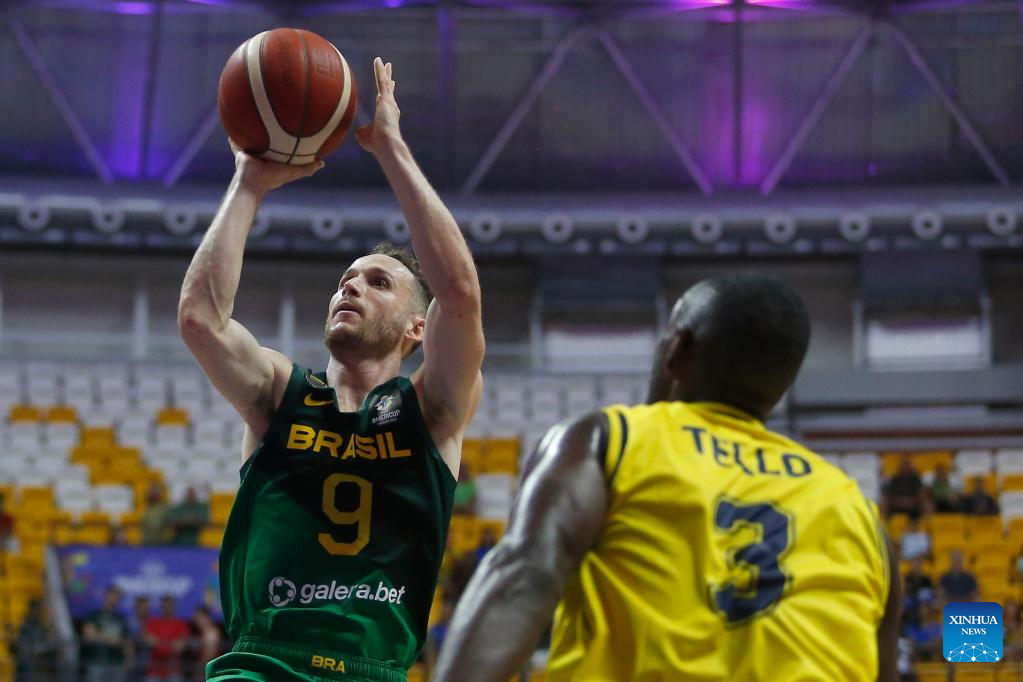 Yago Santos (C) of Brazil competes during a group A match between Brazil and Colombia of the FIBA Americup 2022 in Recife, Pernambuco, Brazil, Sept. 3, 2022. (Photo by Lucio Tavora/Xinhua)