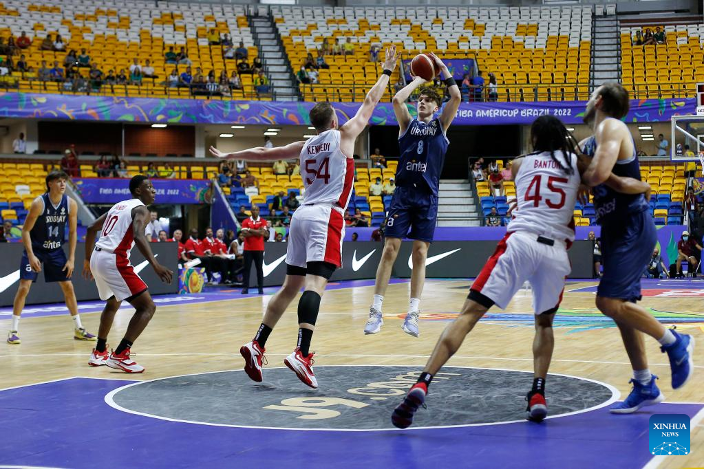 Agustin Ubal (3rd R) of Uruguay shoots during a group A match between Canada and Uruguay at the FIBA Americup 2022 in Recife, Pernambuco, Brazil, Sept. 3, 2022. (Photo by Lucio Tavora/Xinhua)