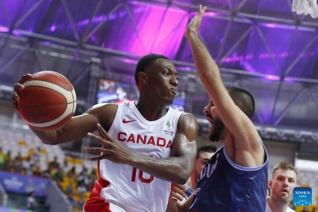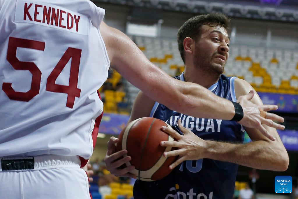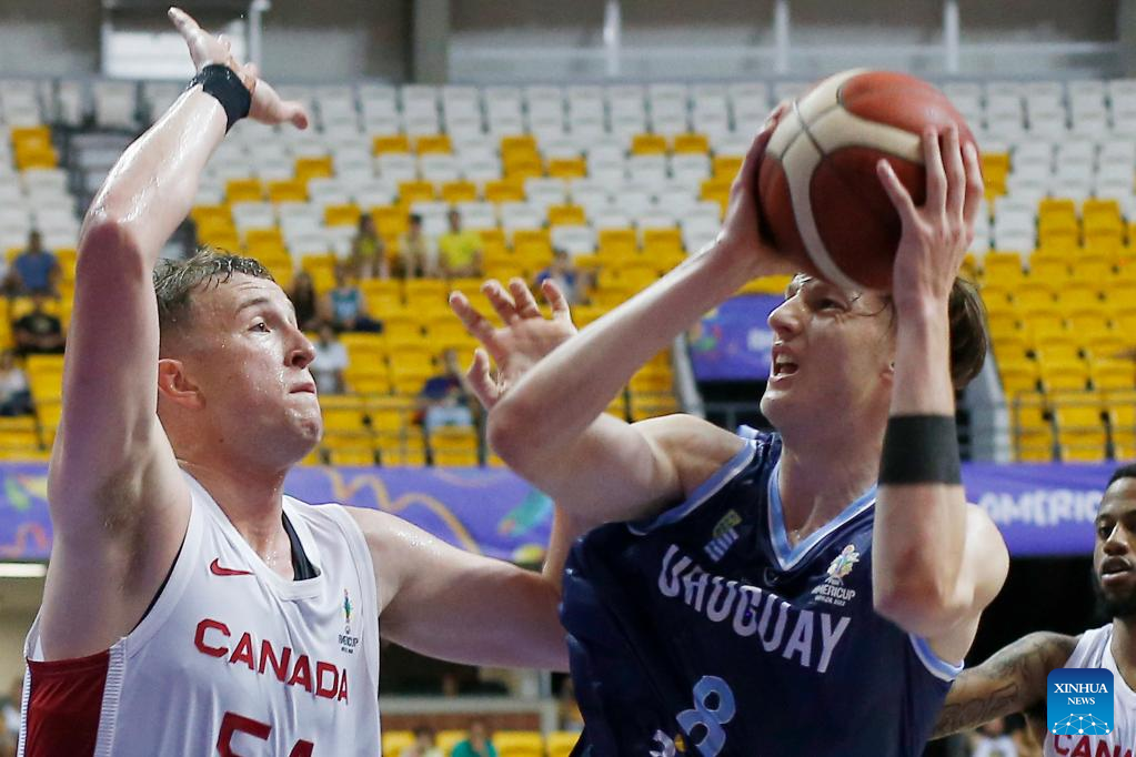 Emiliano Serres (R) of Uruguay breaks through during a group A match between Canada and Uruguay at the FIBA Americup 2022 in Recife, Pernambuco, Brazil, Sept. 3, 2022. (Photo by Lucio Tavora/Xinhua)