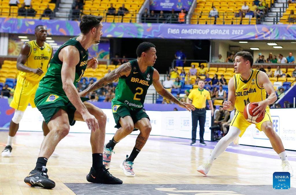 Yildon Mendoza (R) of Colombia competes during a group A match between Brazil and Colombia of the FIBA Americup 2022 in Recife, Pernambuco, Brazil, Sept. 3, 2022. (Photo by Lucio Tavora/Xinhua)