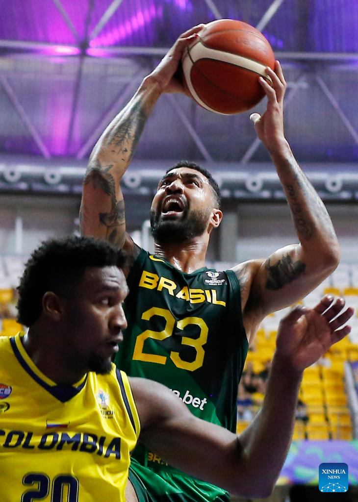 Augusto Lima (R) of Brazil goes for a lay-up during a group A match between Brazil and Colombia of the FIBA Americup 2022 in Recife, Pernambuco, Brazil, Sept. 3, 2022. (Photo by Lucio Tavora/Xinhua)