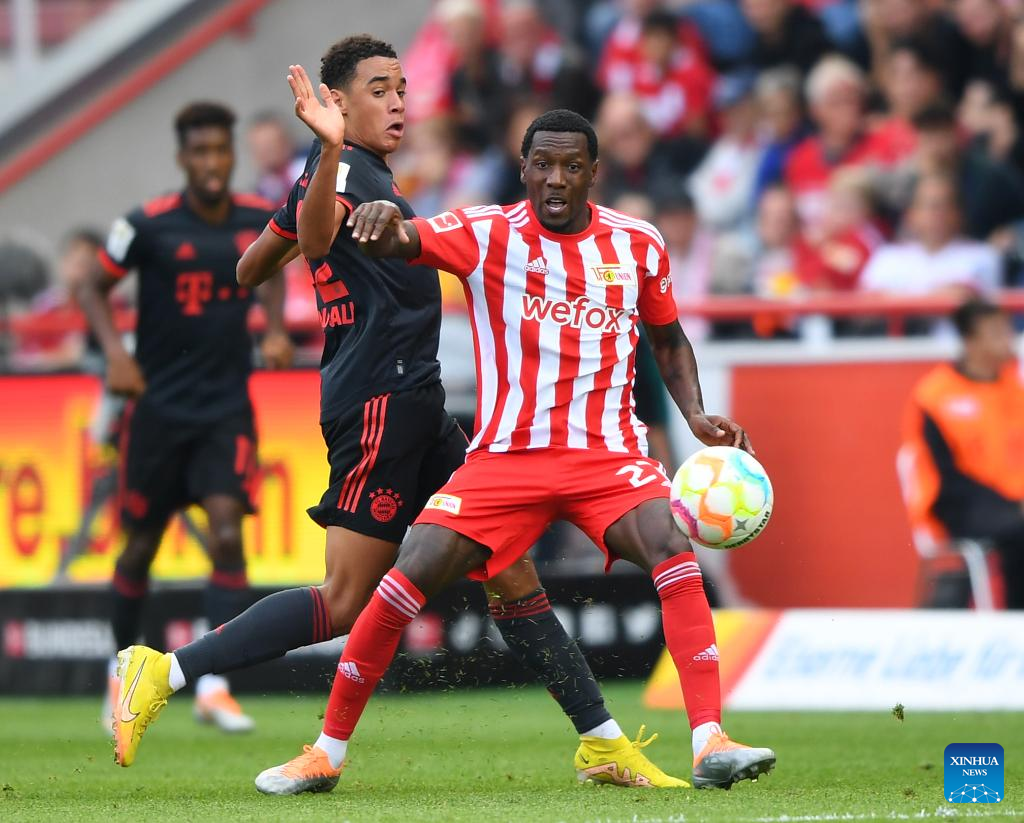 Sheraldo Becker (R) of Union Berlin vies with Jamal Musiala of Bayern Munich during their German first division Bundesliga football match in Berlin, Germany, Sept. 3, 2022. (Xinhua/Ren Pengfei)