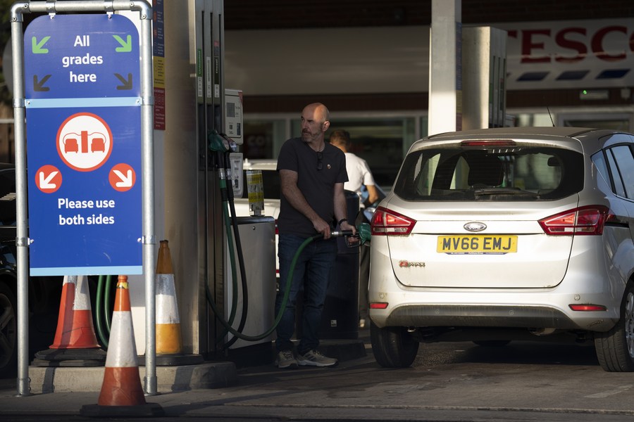 A man refuels his car at a gas station in Manchester, Britain, Sept. 2, 2022. (Photo by Jon Super/Xinhua)