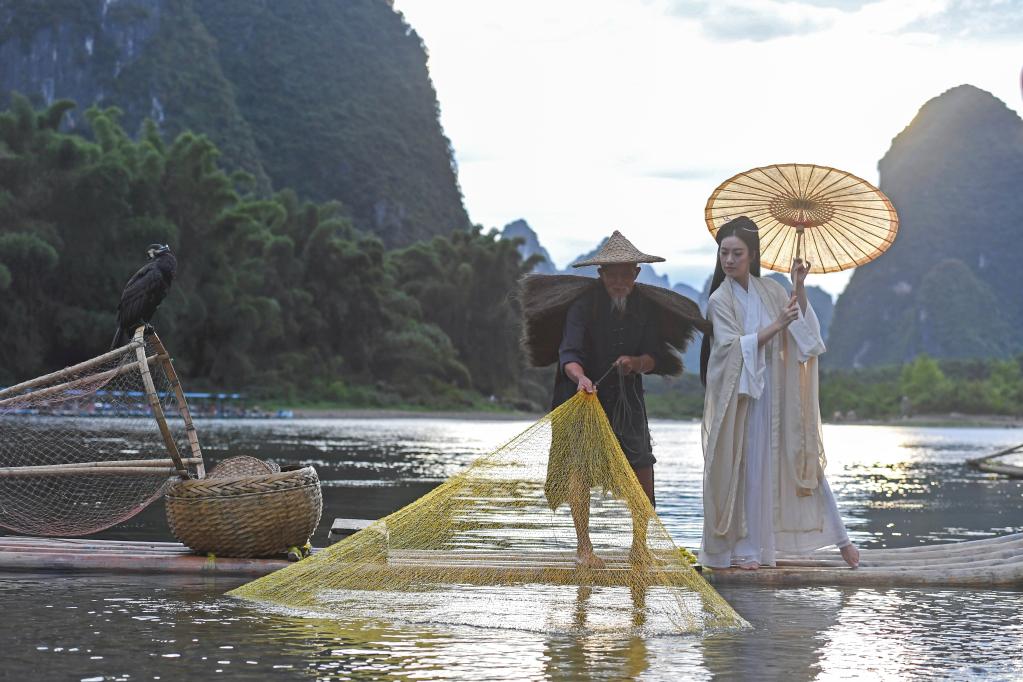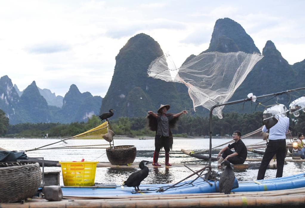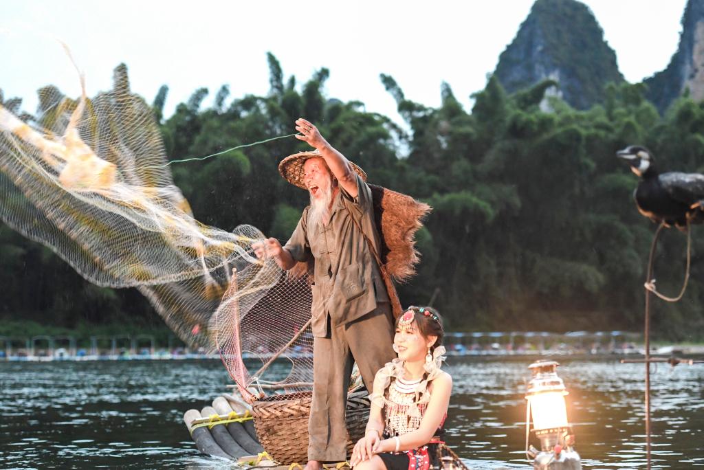 In Xingping Township of Yangshuo County, Guilin City, fishermen have started to work as models for tourists. They also rent fishing tools such as nets, lamps, and bamboo rafts to tourists for taking photographs.