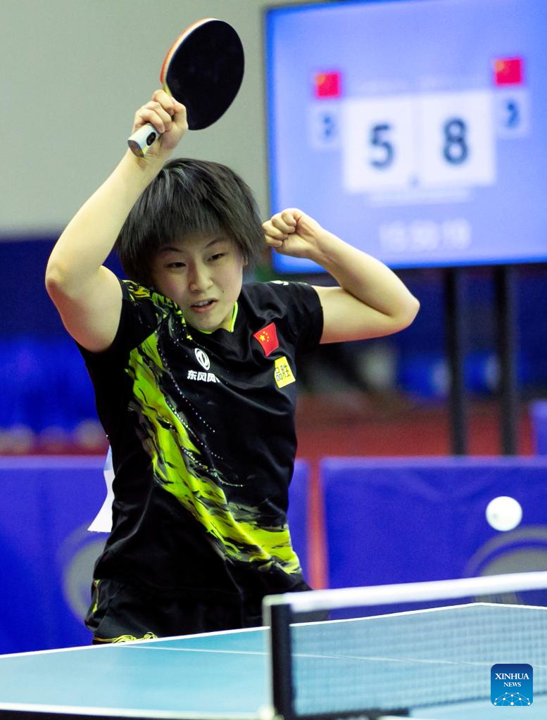 Qin Yuxuan of China competes during the Junior Girls' Singles Final at 26th Asian Junior and Cadet Table Tennis Championships (AJCC) in Vientiane, Laos, Sept. 6, 2022. China won two gold medals in Junior Boys' Singles and Junior Girls' Singles on Tuesday, having previously collected three golds in the Junior Boys, Junior Girls and Cadet Boys. (Photo by Kaikeo Saiyasane/Xinhua)