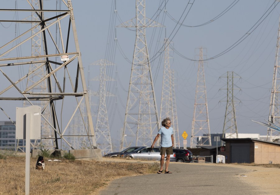 A citizen walks by a high-voltage tower in San Mateo, California, the United States, Sept. 5, 2022. (Photo by Li Jianguo/Xinhua)■