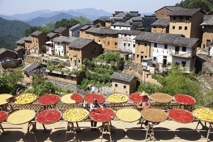 Villagers dry agricultural produce in Shexian County, east China's Anhui Province, Sept. 6, 2022. (Xinhua/Fan Chengzhu)